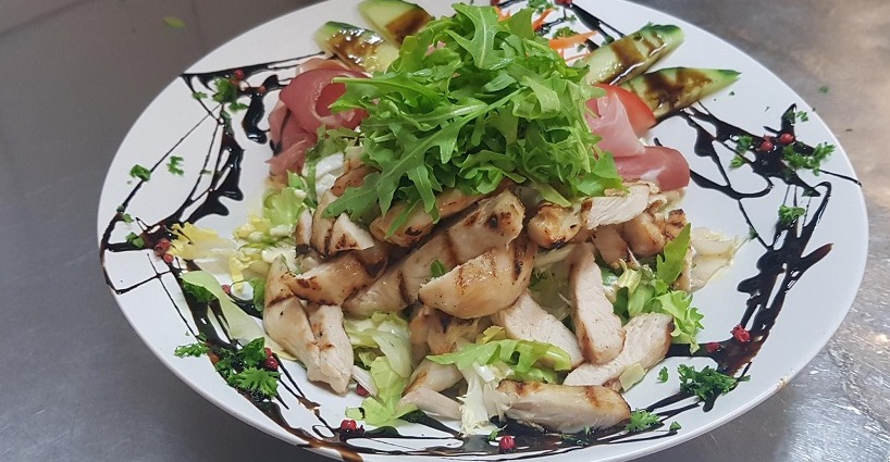 Salade vert, auberginnes et cougettes grillés, rucola, parmesan, tomate cerise