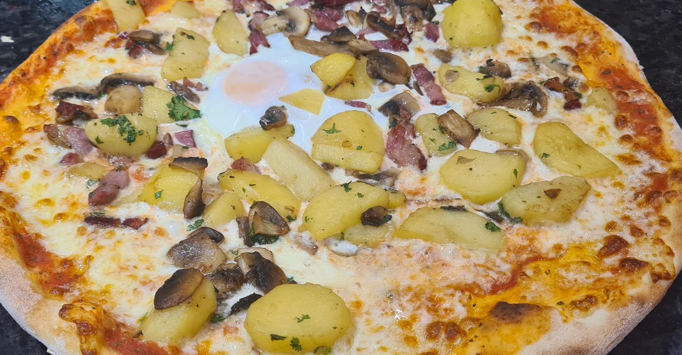 sauce tomate, mozzarella, sauté de pommes de terre,, lardons, champignons, oeuf
