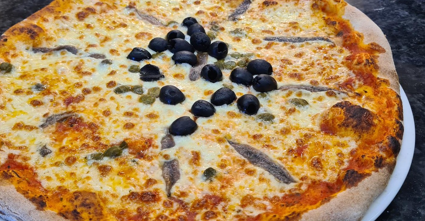 sauce tomate, mozzarella, anchois, olives, câpres